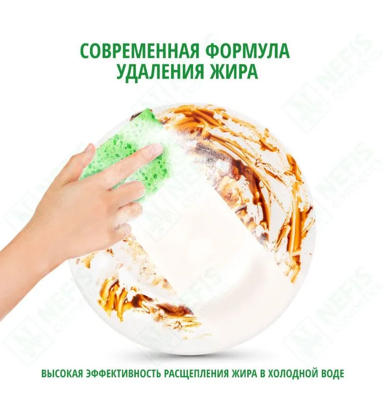 Активная формула быстро удаляет жир и сложные загрязнения, оставляя посуду чистой и свежей.
