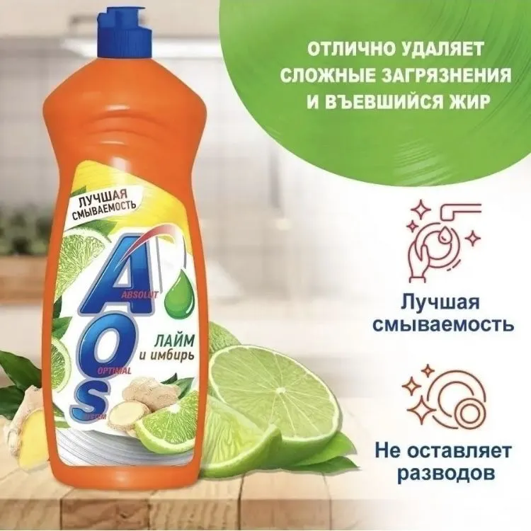 Средство для посуды AOS «Лайм и имбирь» объёмом 900 г — эффективное решение для ручного мытья посуды на профессиональных кухнях г. Астана.