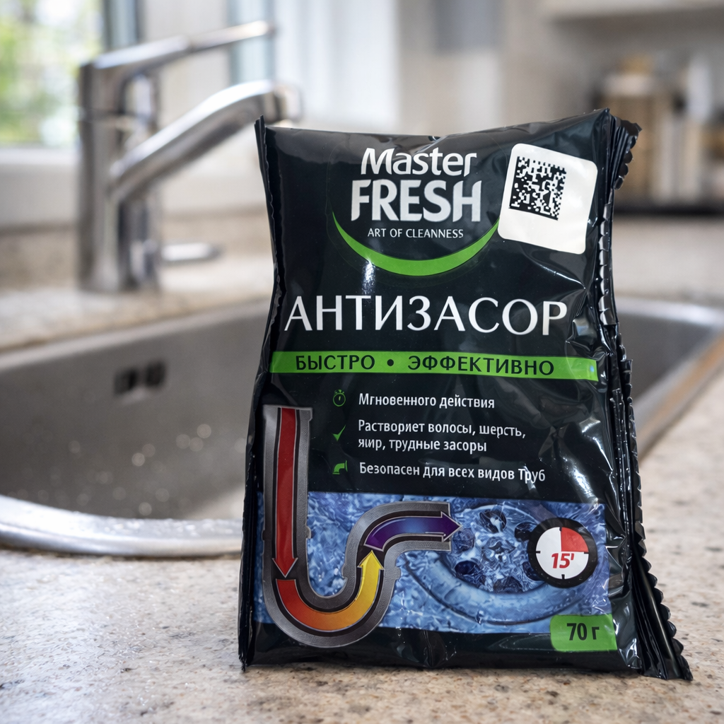 Порошок Master Fresh Антизасор (70 г) — эффективное средство для быстрого устранения засоров в раковинах, трубах и сливных системах на объектах г. Астана.